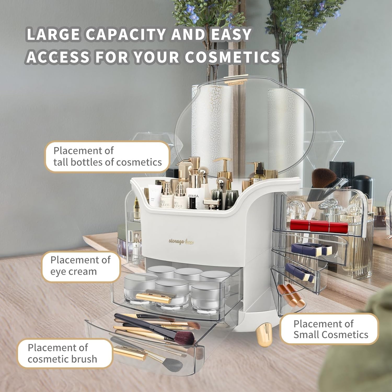 - 𝐋𝐚𝐫𝐠𝐞 𝐂𝐚𝐩𝐚𝐜𝐢𝐭𝐲 𝐌𝐚𝐤𝐞𝐮𝐩 𝐎𝐫𝐠𝐚𝐧𝐢𝐳𝐞𝐫 : storage box and organiser Industry-Leading 3-Layer large capacity Design. The makeup storage box can store different shapes and sizes of cosmetics while keeping them well organized. It can store skin care products,cosmetics,lipsticks and jewelry organizer.